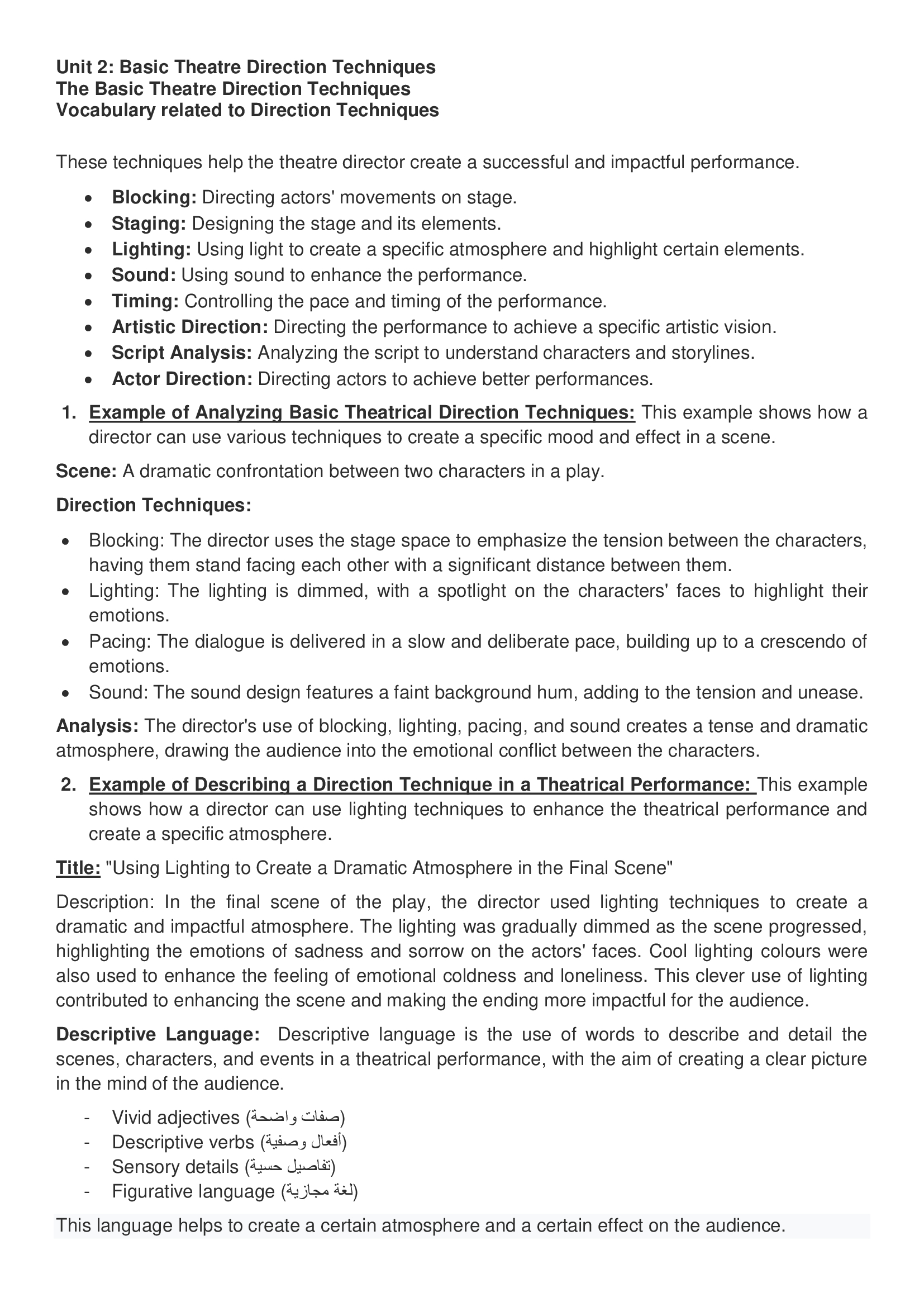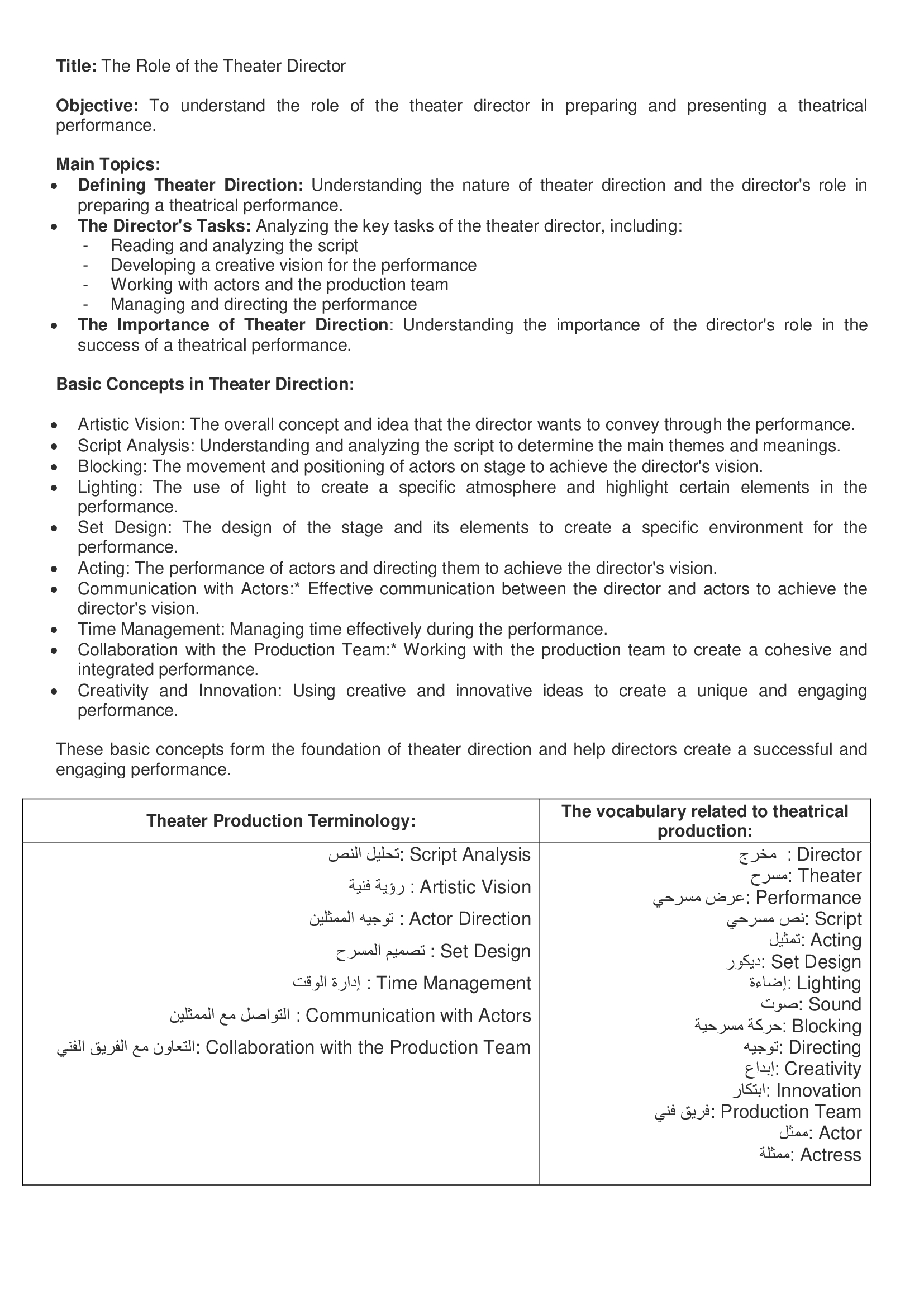 The goal of the English lessons is to understand the basic concepts of theatrical production and to master the vocabulary related to what is called descriptive language, as well as to know the history of theater and the historical vocabulary related to it that helps in reading the main theatrical movements, known as comparative language. Through the lessons, the student explores the techniques of theatrical direction and describes them in a theatrical presentation, as well as learns about literature and the directing styles applied in English theater. The aim of English classes as a secondary foreign language is to enable students to effectively use the specialized terminology relevant to their field of study.