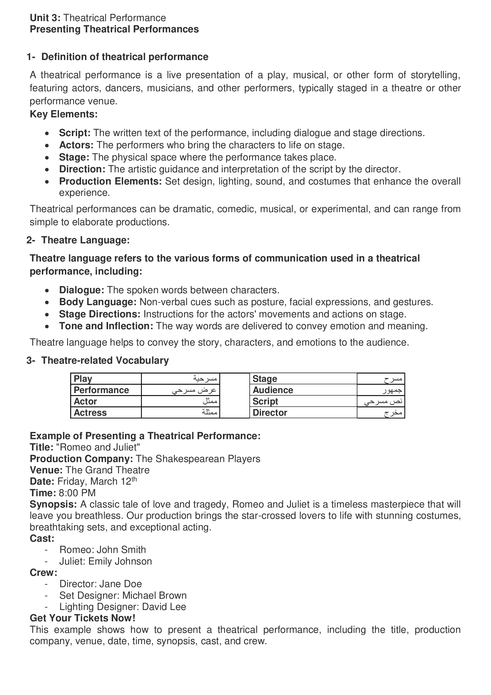 يقدم هذا المحتوى، سلسلة من المحاضرات الأكاديمية لمقياس نظرية التأليف المسرحي، مدخلاً شاملاً للدراما والمسرح، مُركزًا على تحليل المكونات الأساسية للنص المسرحي. ويؤكد على أن النص المسرحي كيان فني متكامل يتكون من عناصر متضافرة، مشدداً على أهمية عنصر التأليف المسرحي وسمات المؤلف الذي يجب أن يمتلك الموهبة والثقافة والقدرة على تحقيق التوازن بين الشكل والمضمون. كما يستعرض المصدر بالتفصيل العناصر الأساسية للنص الدرامي وهي الفكرة (الثيمة)، والشخصية بأبعادها الثلاثة (الفسيولوجية والاجتماعية والنفسية)، والحبكة بأجزائها المختلفة (كالأزمة والذروة والحل)، بالإضافة إلى الحوار الدرامي والصراع كعمود فقري للبناء. وأخيراً، يختتم بتوضيح أهم الاتجاهات الدرامية العالمية المؤثرة مثل الإبسنّية، واتجاه برنارد شو (مسرح الفكرة)، وتشيكوف، والمسرح الملحمي لبريخت، ومسرح العبث.