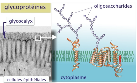 Ils constituent le cell coat ou glycocalyx qui est une couche localisée à la surface de la membrane plasmique, Glucides liés soit à des lipides, soit à des protéines.